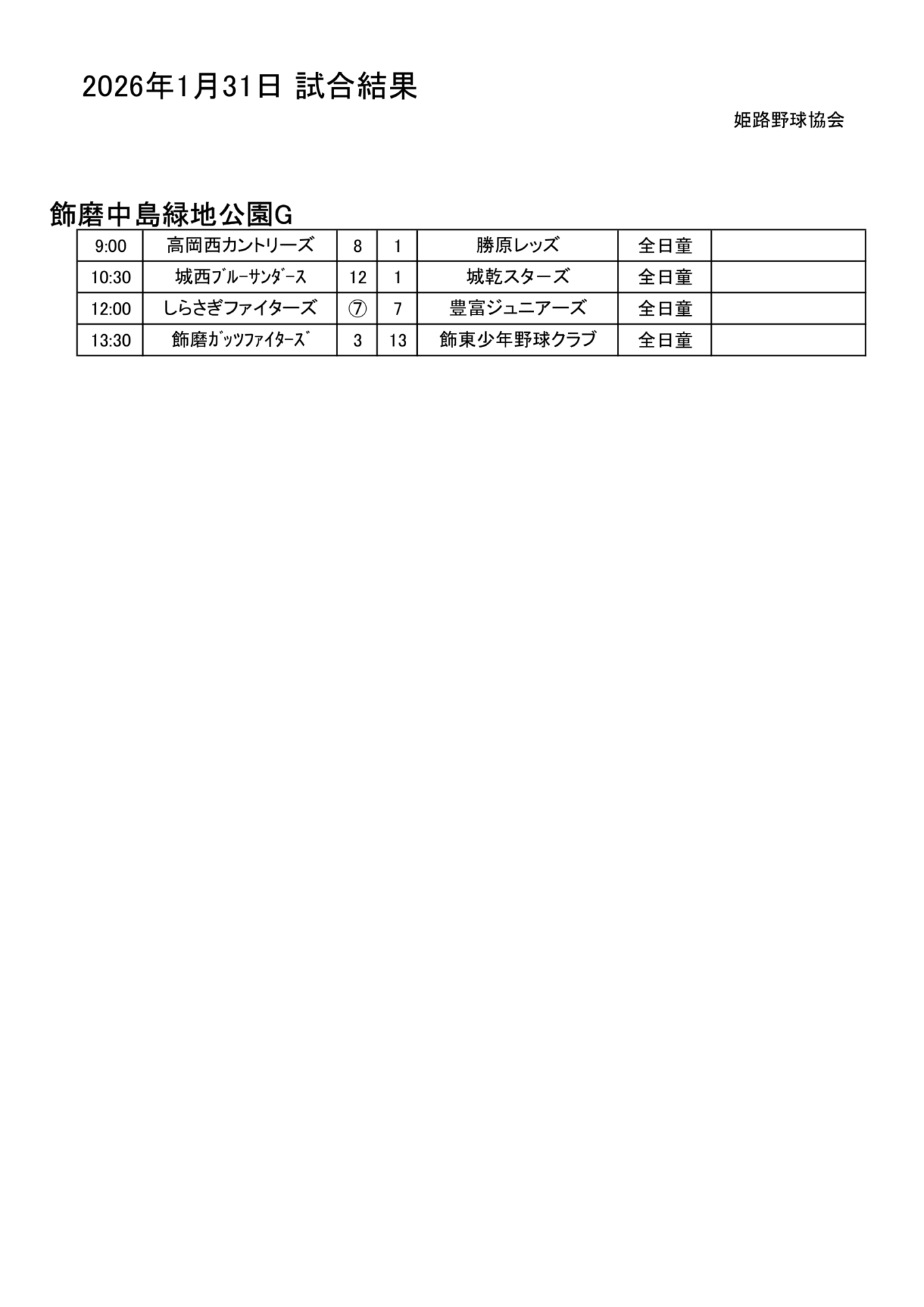2026年1月31日(土)試合結果