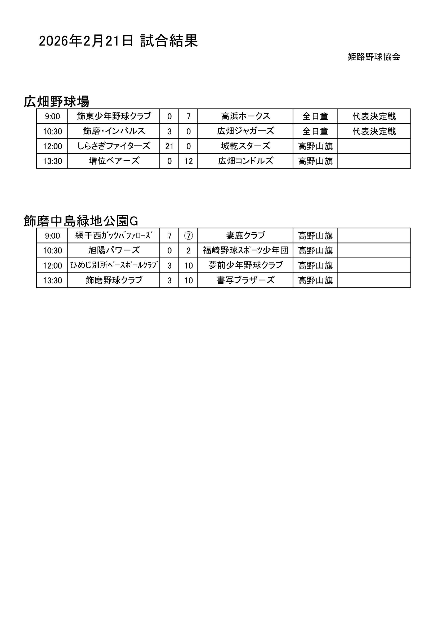 2026年2月21日(土)試合結果