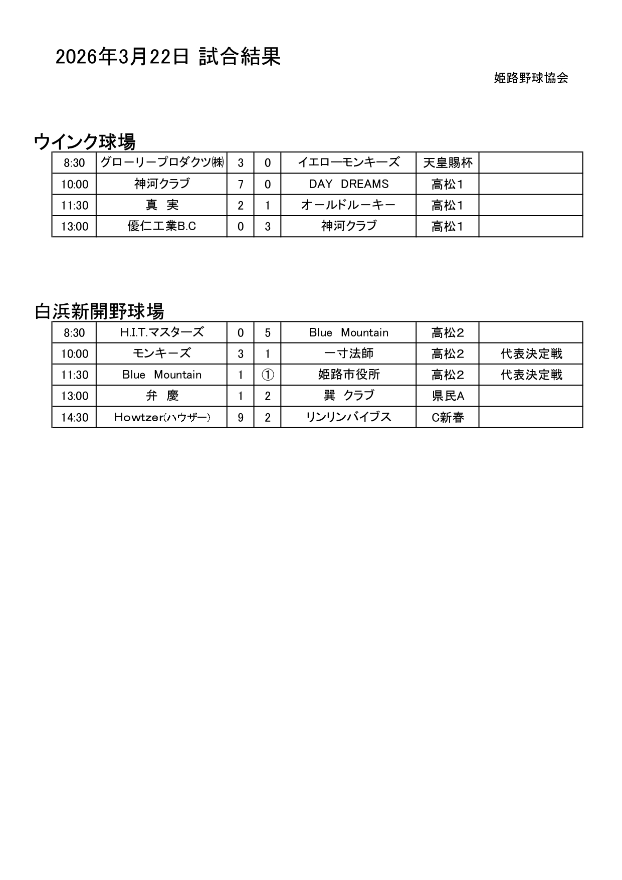 2026年3月22日(日)試合結果
