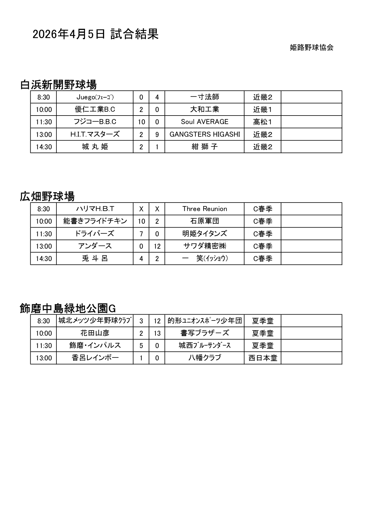 2026年4月4日(土)試合結果